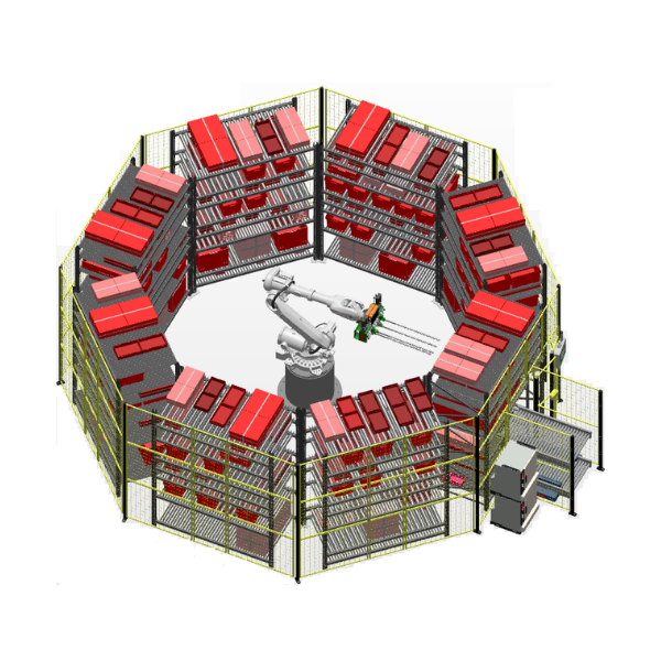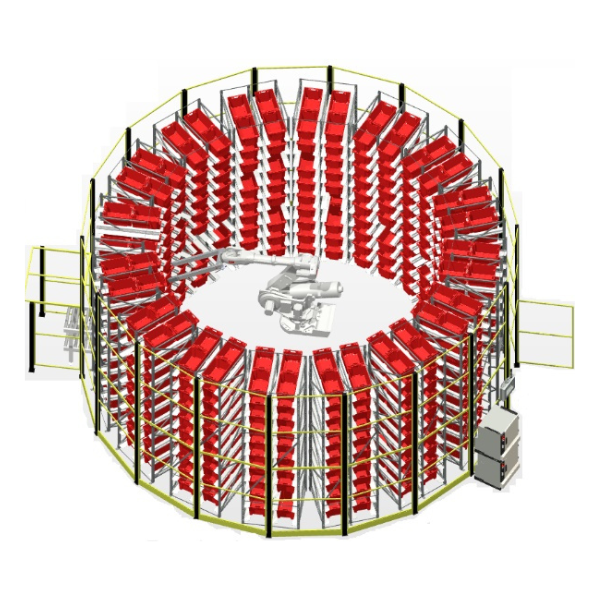 The RBS uses high-density automated storage combined with robotic retrieval and intelligent release logic. There is a centrally located industrial robot positioned to access storage racks that surround it. Products, cartons, or totes are stored in a structured environment and released based on downstream demand rather than arrival order. This allows upstream processes to continue operating while downstream processes catch up or rebalance, maintaining consistent throughput across the system.